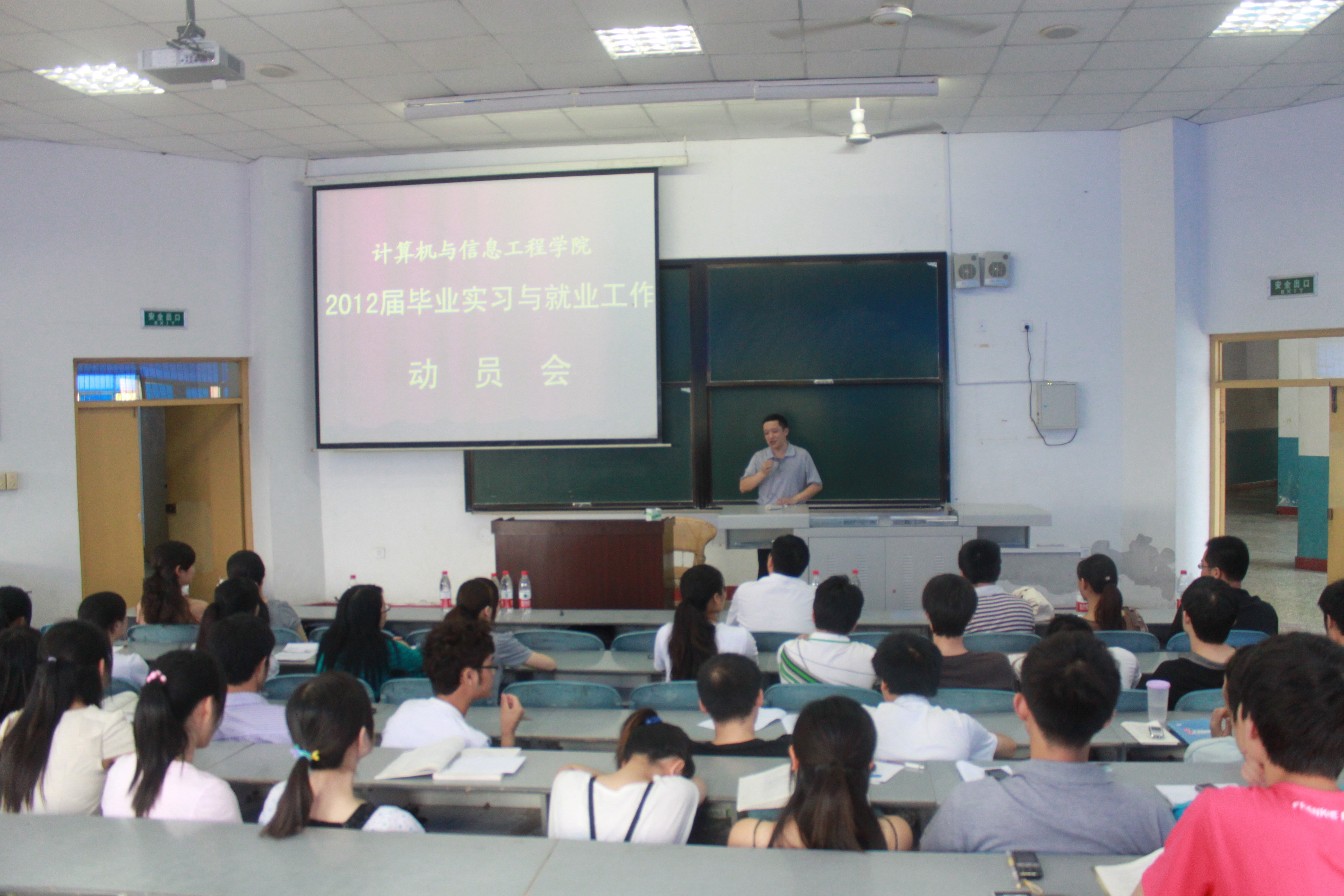 2011年6月21日下午,计算机学院在三教楼A103教室举行了2012届毕业实习和就业工作动员会。计算机学院院长李忠、党总支书记荣莉、副院长覃凤清、团总支书记万敏、教学秘书杨强以及陈金华、左志洪、黄剑樱等老师和全体2008级本科同学出席了动员会。动员会由教学秘书杨强主持。