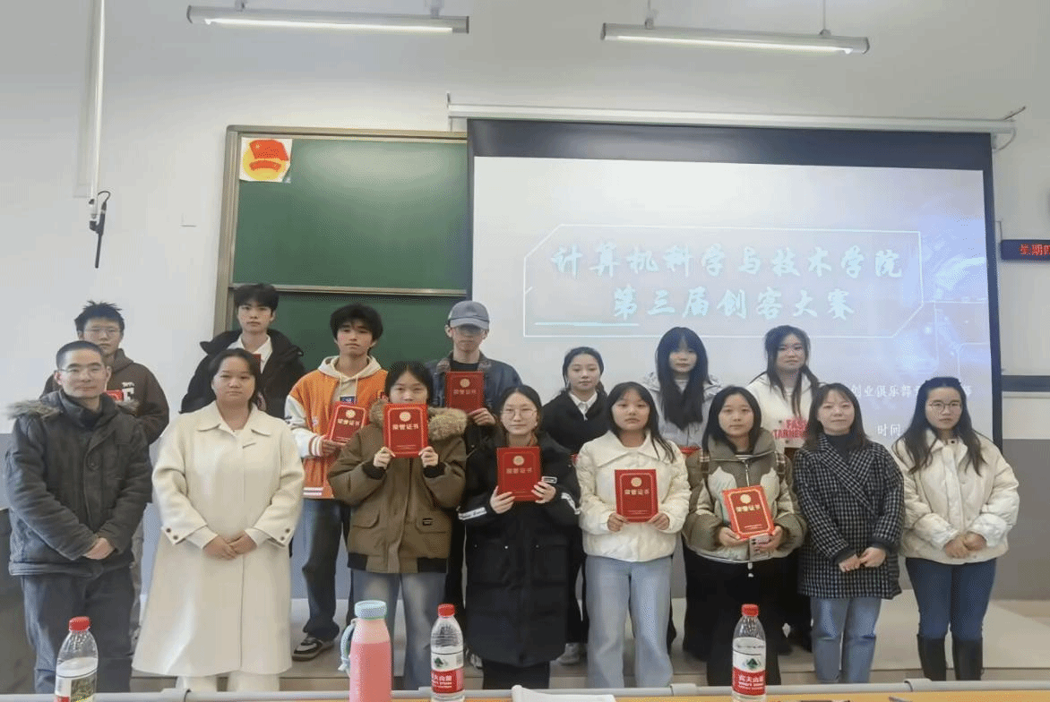 项目路演环节落幕,教师评委从项目创新性、团队协作等维度展开综合评分,工作人员同步进行分数统计,确定获奖团队名单。随后,评委教师为获奖团队颁发荣誉证书,现场与所有团队成员合影留念。