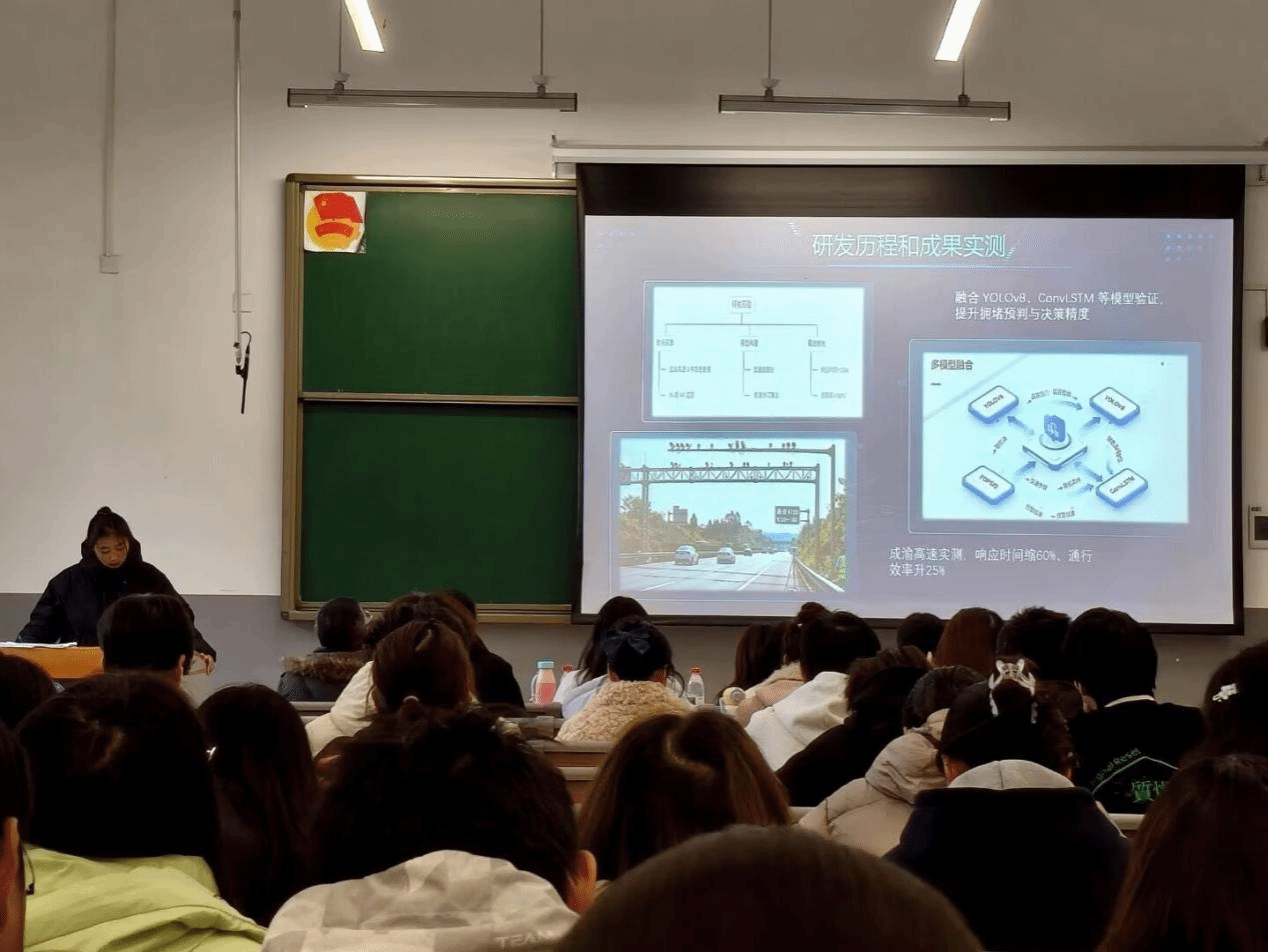 第二位主讲人站在台前,结合项目研发中的细节,向在场同学拆解技术落地的关键步骤。台下同学都专注地看向讲台,随着这场分享的推进,大家对挑战杯项目从创意到实践的流程有了更具体的认知,也为自己后续梳理参赛思路提供了可参考的实例。