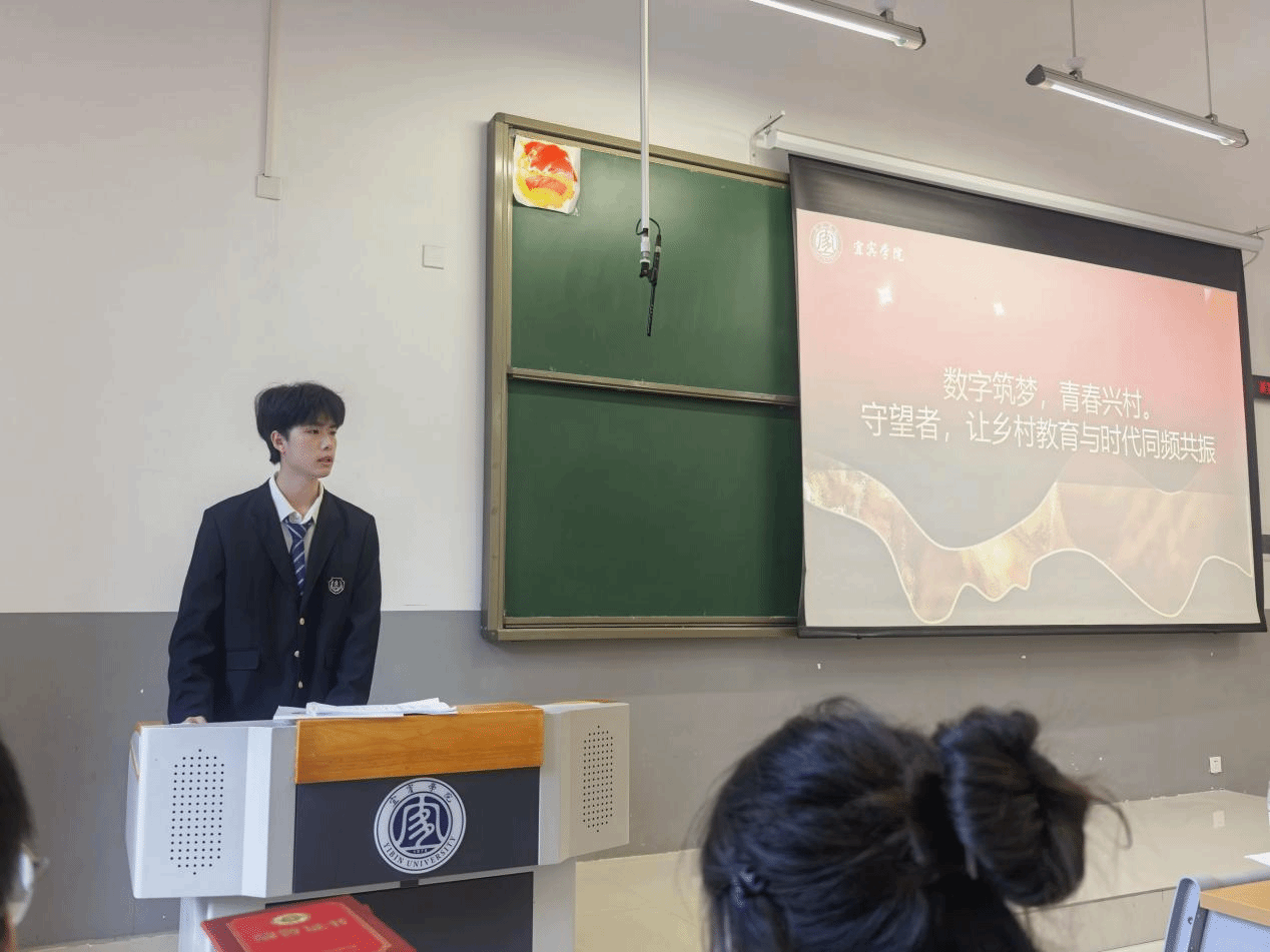 第三位主讲人站在讲台前,结合投影上“守望者,让乡村教育与时代同频共振”的主题,向在场同学介绍项目如何用数字技术为乡村教育搭建帮扶平台,分享团队在调研乡村学校需求、设计适配课程资源时的经历,让大家直观感受到青年项目里的乡土情怀与创新温度。