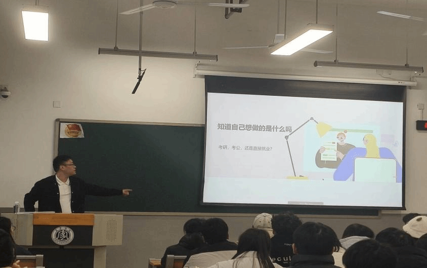 活动开场,“罗尹首先以“知道自己想做的是什么吗”“怎么知道自己想做什么”“知道自己想做什么后怎么干”三连问引发学子思考。你考研、考公,还是直接就业?”引发在场学子思考。他结合自身职业经历解析不同发展路径的适配性,帮助同学们明确职业规划的核心逻辑。