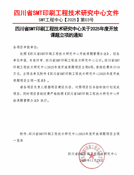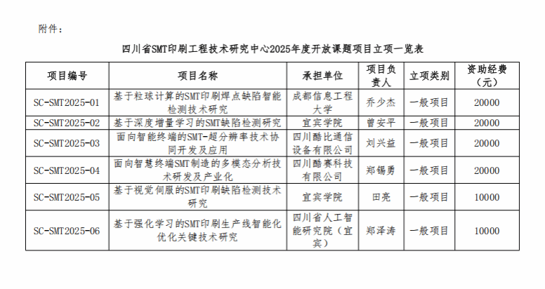 四川省SMT印刷工程技术研究中心2025年度开放课题立项公示
