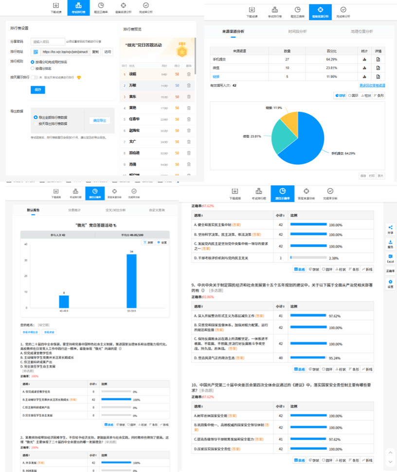 活动严格遵循“二十届四中全会精神 + 爱国主义教育”双主线。为确保学习效果,支部精心组织了线上专题学习与知识竞答。依托问卷星平台,支部发布了涵盖四中全会核心要义及活动主题的11道题目题库,重点考察党员对“坚持和完善中国特色社会主义制度、推进国家治理体系和治理能力现代化”等重大决策部署的理解。竞答环节得到了党员教师的积极响应,参与率达91%(42/46),平均分高达92.4分,其中41人得分在90分以上,合格率89.1%,充分展示了支部党员扎实的理论学习功底。其中,陈明香老师以1分58秒的最快速度准确完成答题,体现了高效的学习能力。针对竞答中错误率较高的“国家安全领导体制”相关题目,支委及时在群内进行了深入解析,巩固了学习成果。