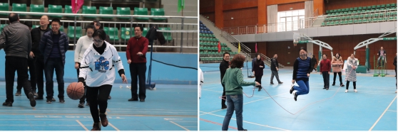 在趣味运动比赛中,整个体育馆都回荡着老师们的呐喊声,参赛队员以最快的速度运篮球、跃过长绳,用一次次律动的拍球、跳跃动作,挑战着自己的力量和耐力。场上篮球的冲击声、长绳拍打地面的声音和选手们铿锵有力的跳跃声此起彼伏,整个赛场气氛积极热烈。